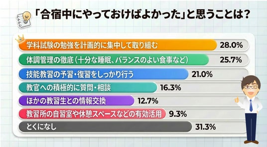 教習以外で集中力を下げた要因として、「体調不良(27.3%) ※図3」のほか、「友人との交流やレクリエーション(27.0%) ※図3」や「教習所の環境(22.7%) ※図3」が挙げられました。卒業生からのアドバイスでは、「疑問点や不安なことは、すぐに教官に質問するべき(26.7%) ※図4」「体調管理を最優先に考えるべき(23.7%) ※図4」、「他の教習生との情報交換(24.3%) ※図4」が有効とされています。 また、後悔した点として「学科試験の勉強を計画的に進めればよかった(28.0%) ※図5」という声も多く、事前学習の重要性が浮き彫りになりました。