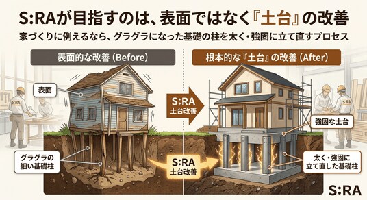家づくりに例えるなら、グラグラになった基礎の柱を太く・強固に立て直すプロセスです。