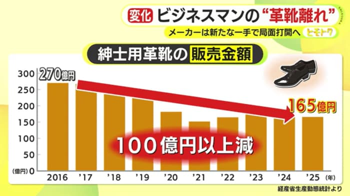 経済産業省の調査によると2025年における紳士用革靴の販売金額は約165億円。