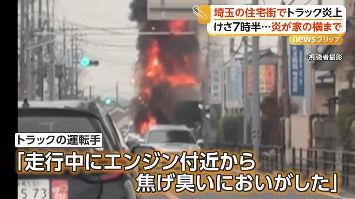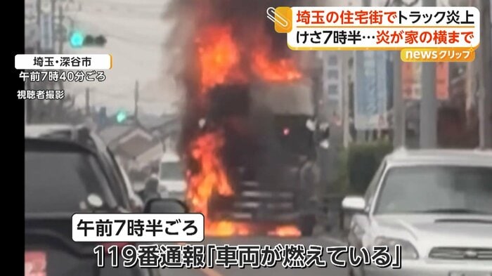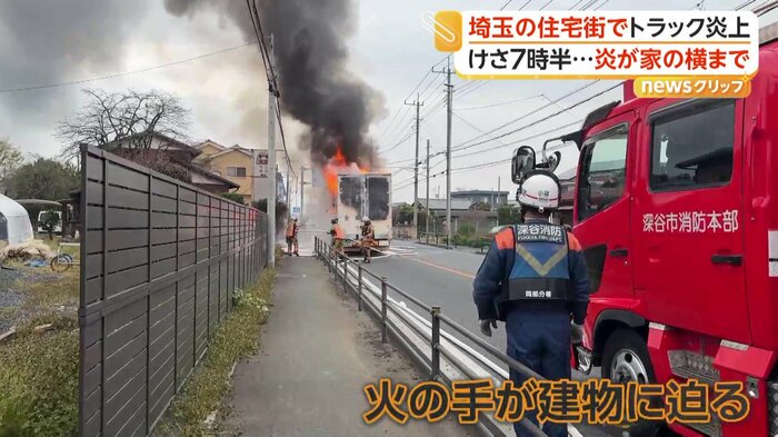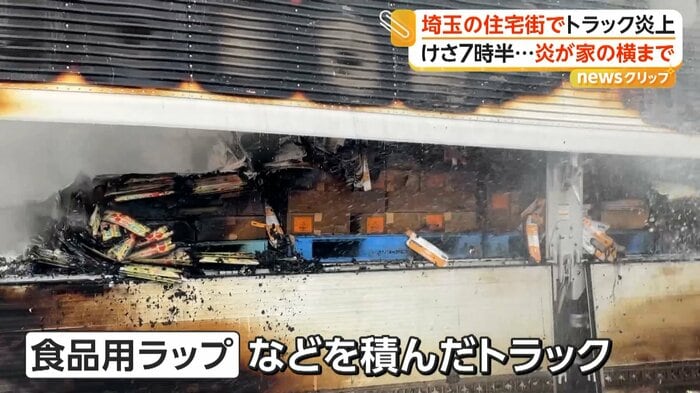 埼玉・深谷市の住宅街近くの交差点で3月31日、食品用ラップなどを積んだトラックが走行中に炎上した。