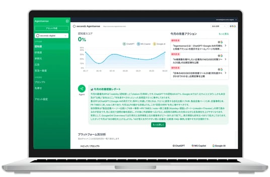 AI検索時代における企業やサービスの見え方を可視化し、改善につなげるAI検索プラットフォーム「secondz Agentsense」を提供しています。生成AI上での認識や参照状況の把握から、改善提案までを支援しています。