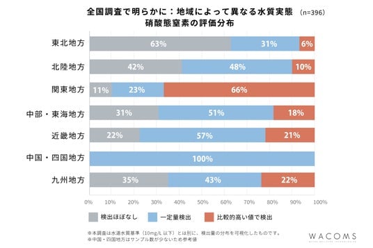 WACOMSでは、全国の家庭を対象に水質検査を実施。その結果、約70%の家庭で硝酸態窒素が検出され、地域によって差があることも確認されました。