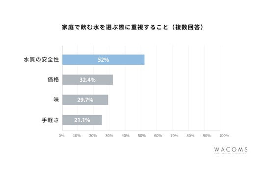 さらに、「家庭で飲む水を選ぶ際に重視すること」としては、「水質の安全性」「価格」「味」が上位に挙がりました。