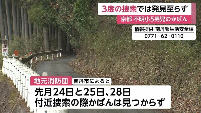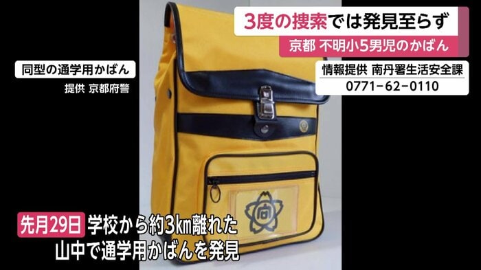 京都府南丹市で行方不明になった男子児童の通学用カバンについて、3月29日に山の中で発見される以前に地元消防団が付近を捜索した際は見つからなかったことがわかった。
