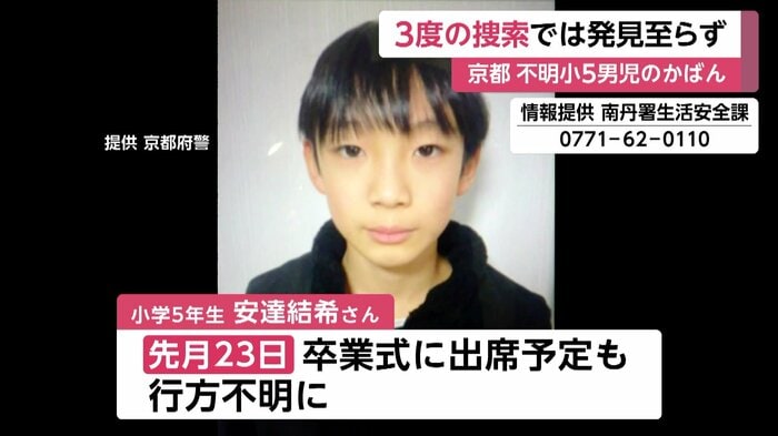 南丹市立園部小学校5年の安達結希さんは、3月23日、卒業式に出席する予定でしたが、その後、行方が分からなくなっている。