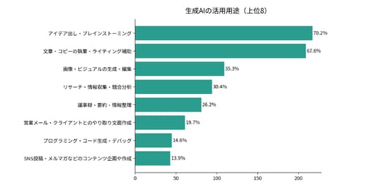 また、76.4%が「10%以上の時短」を実感しており、そのうち48.2%は「30%以上の時間短縮」を感じていました。生成AIは単なる補助的ツールではなく、作業工程そのものを再編する実務インフラへ移行しつつあると考えられます。