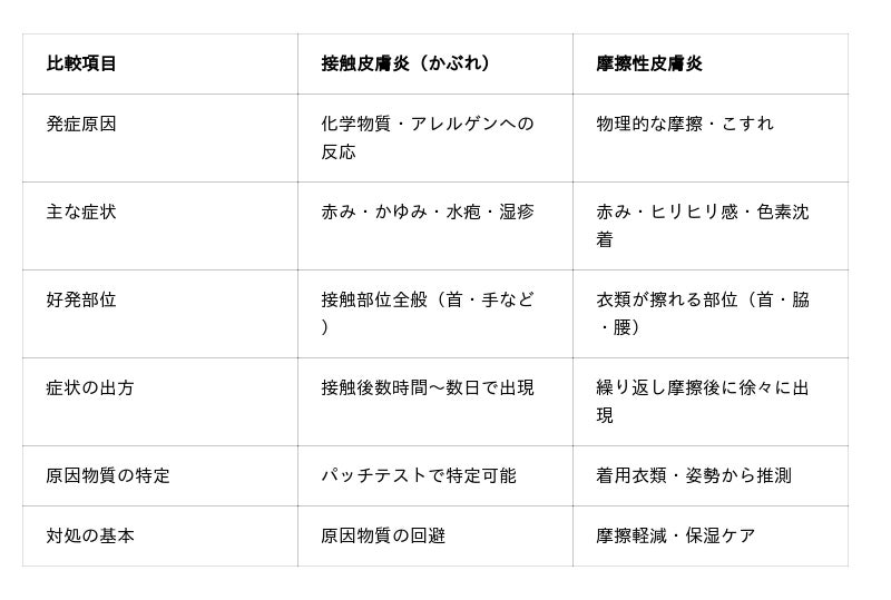 A. 接触皮膚炎は化学物質への反応、摩擦性皮膚炎は物理的な擦れが原因という違いがあります。