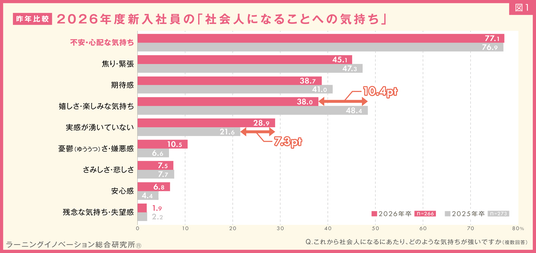1. 社会人になることへの気持ち、「不安・心配」が約8割でトップ。「嬉しさ・楽しみ」は昨年から10.4ポイント減