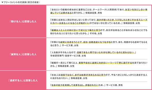 こうした不安を背景に、新入社員が理想とする仕事スタイルは「安定重視」が最も多く、無理に挑戦するよりも、できることを着実に積み重ねていく働き方を志向する傾向が見られました。また、理想の社会人像では「助ける人」が2年連続で1位となり、「誠実な人」が昨年より順位を上げて2位に浮上しました。自由記述からは、成果やスピードよりも、周囲への配慮や信頼関係、組織の一員として誠実に行動する姿勢を重視する価値観が強く表れていました。
