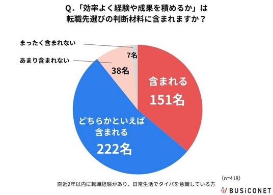 「Q.転職先を検討するうえで、「効率よく経験や成果を積めるかどうか」は、判断材料のひとつに含まれますか?」という問いに対して、「含まれる」「どちらかといえば含まれる」と答えた人が373名でした。