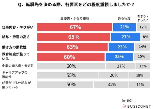 「Q.あなたは転職先を決める際、以下の要素をそれぞれどの程度重視しましたか?」という設問で、「最優先」「かなり重視」の割合が最も高かった要素は、「仕事内容・やりがい」が67%、次に「給与・待遇の高さ」が65%という結果でした。一方で、「働き方の柔軟性」は63%、「教育制度が整っている」は60%であり、これらも給与・やりがいに並ぶ高さで重視されています。