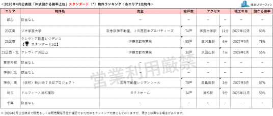 昨今のマンション価格の高騰を受け、購入検討時に資産性を重視する消費者の割合が高まりつつあります。このような社会動向と消費者ニーズをふまえ、「住まいサーフィン」では資産性を重視したマンション選びの支援を目的に、首都圏のマンションを「沖式儲かる確率」の高い順にランキング化し、毎月発表しています。対象物件は、首都圏で販売中および販売予定のマンションで、本リリースでは9エリアにおける“スタンダード(*)”物件と“家活(*)”物件それぞれ1位の物件のみを公表しています。