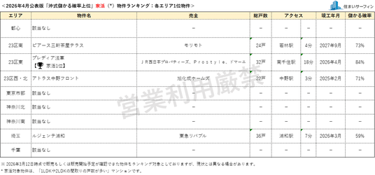 不動産ビッグデータでビジネス展開するスタイルアクト株式会社(東京都中央区・代表取締役:沖有人)は、首都圏のマンションのうち、資産性の保たれやすさを確率で示した指数「沖式儲かる確率」のエリア別上位マンションランキング2026年4月版を自社が運営する「住まいサーフィン( https://www.sumai-surfin.com/ )」にて公表しました。