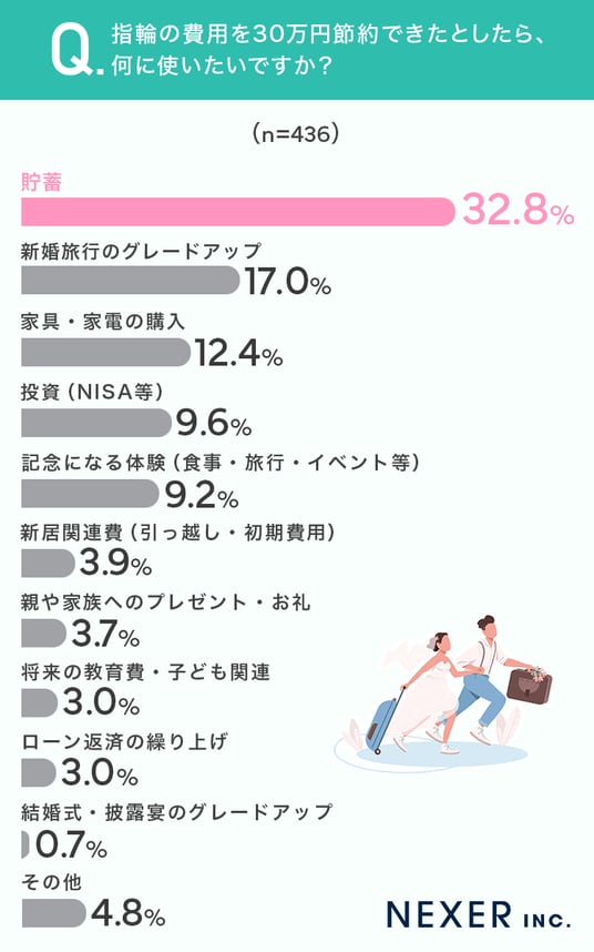 ■結婚指輪・婚約指輪をトータルで賢く選んで生まれた余裕、活かし方1位は「貯蓄」で32.8%