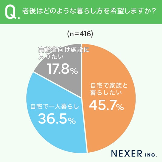 「自宅で家族と暮らしたい」が45.7%で最も多く、「自宅で一人暮らし」が36.5%、「高齢者向け施設に入りたい」が17.8%という結果になりました。
