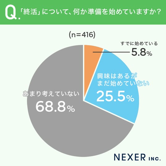 「あまり考えていない」が68.8%で最多となり、「興味はあるがまだ始めていない」が25.5%、「すでに始めている」はわずか5.8%という結果でした。