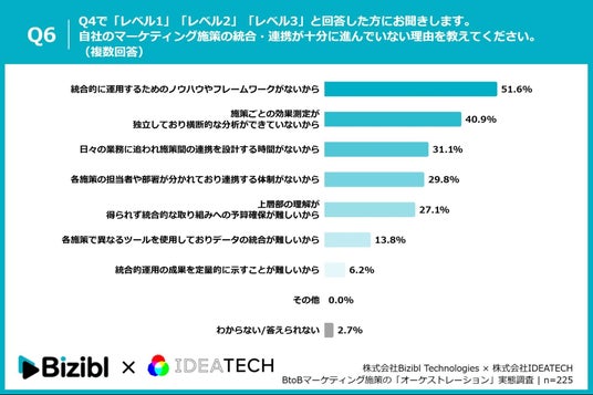 「Q6. Q4で「レベル1」「レベル2」「レベル3」と回答した方にお聞きします。自社のマーケティング施策の統合・連携が十分に進んでいない理由を教えてください。(複数回答)」(n=225)と質問したところ、「統合的に運用するためのノウハウやフレームワークがないから」が51.6%、「施策ごとの効果測定が独立しており横断的な分析ができていないから」が40.9%、「日々の業務に追われ施策間の連携を設計する時間がないから」が31.1%という回答となりました。