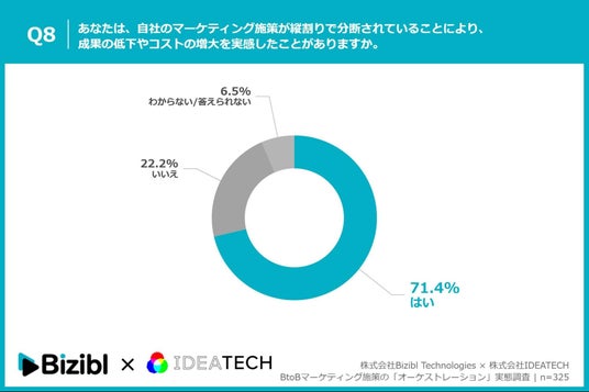 「Q8. あなたは、自社のマーケティング施策が縦割りで分断されていることにより、成果の低下やコストの増大を実感したことがありますか。」(n=325)と質問したところ、「はい」が71.4%、「いいえ」が22.2%という回答となりました。