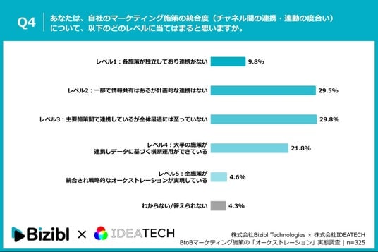 「Q4. あなたは、自社のマーケティング施策の統合度(チャネル間の連携・連動の度合い)について、以下のどのレベルに当てはまると思いますか。」(n=325)と質問したところ、「レベル1:各施策が独立しており連携がない」が9.8%、「レベル2:一部で情報共有はあるが計画的な連携はない」が29.5%という回答となりました。
