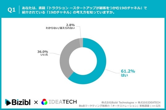 「Q1. あなたは、書籍『トラクション ースタートアップが顧客をつかむ19のチャネル』で紹介されている「19のチャネル」の考え方を知っていますか。」(n=325)と質問したところ、「はい」が61.2%、「いいえ」が36.0%という回答となりました。