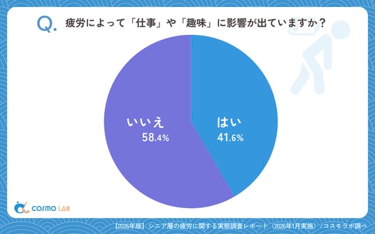 疲労によって、趣味や仕事に影響が出ている層は「いいえ」(58.4%)が最多でした。一方で「はい」(41.6%)と回答した人も、4割を占めました。