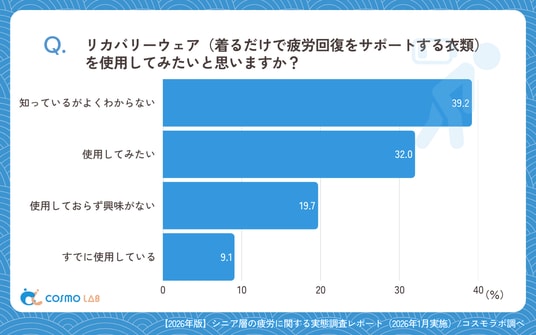 「すでに使用している」(9.1%)は限定的であり、「使用しておらず興味がない」(19.7%)も一定割合見受けられました。この結果から、リカバリーウェアに関心はあるものの、実際の利用にはまだ至っていない層が多い状況がうかがえます。