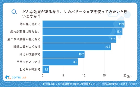 「体が軽く感じる」(19.9%)と回答した人が最も高く、「疲れが翌日に残らない」(19.4%)、「肩こりや腰痛が軽くなる」(17.9%)、「睡眠の質がよくなる」(16.6%)が続きました。