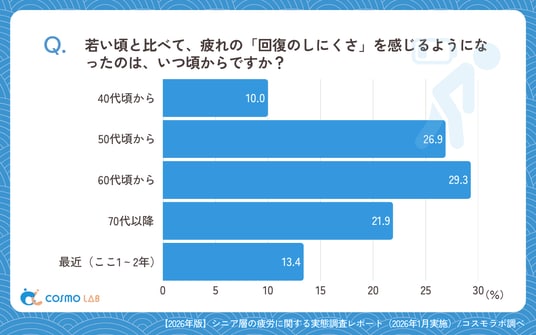 「昔より疲れが取れにくくなった」と答えた人は、80.6%にのぼりました。また回復しにくさを感じ始めた時期は「60代頃から」(29.3%)が最多で、「50代頃から」(26.9%)も近い割合となっています。