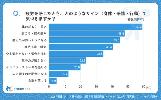 シニア専門のマーケティングプラットホーム コスモラボ(会社名:コスモヘルス株式会社、本社:東京都港区、代表取締役社長 小塚 崇史)がシニア層の『疲労』に関するアンケートリサーチのレポートをリリースしました。本レポートでは、50代以上のシニア層を対象に、疲労の自覚や疲れに気づくサイン、日常生活への影響や疲労対策として意識する生活習慣などを調査しました。