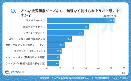 無理なく続けられそうな疲労回復グッズとして最も多かったのは、「リカバリーウェア(着るだけで疲労回復をサポートする衣類)」(52.6%)でした。