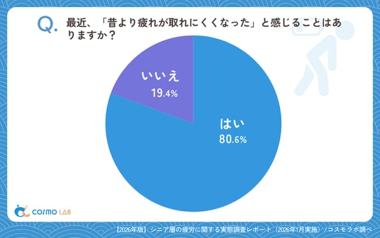 昔より疲れが取れにくくなったと感じるシニアは、「はい」(80.6%)と回答した層が「いいえ」(19.4%)を大きく上回りました。このような結果から、多くのシニアが、以前よりも疲れから回復しにくくなったと感じていることが分かります。