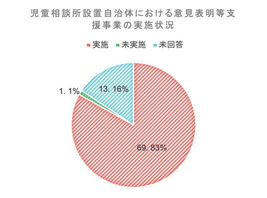 「意見表明等支援事業」の実施状況児童相談所設置自治体82自治体のうち、本調査に回答したのは84.1%(69自治体)、未回答は15.9%(13自治体)であった。そのうち「意見表明等支援事業」を実施している自治体は98.6%(68自治体)、未実施は1.4%(1自治体)であった。以上より、児童相談所設置自治体82自治体のうち82.9%(68自治体)が「意見表明等支援事業」を実施していることが明らかになった。