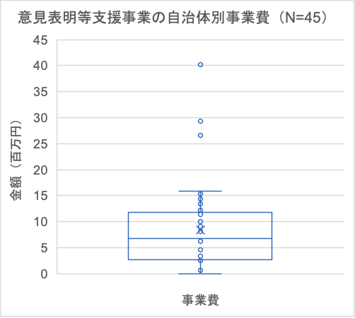 運営財源 事業費意見表明等支援事業を実施する68自治体のうち、事業費に回答した45自治体を対象とする。自治体別事業費の中央値は671.5万円、平均は832.8万円であった。事業費は0円から4,015.8万円まで幅があり、自治体間で大きな差がみられる。金額区分別にみると、1,000万円未満:30自治体(66.7%)、1,000万円以上2,000万円未満:12自治体(26.7%)、2,000万円以上:3自治体(6.7%)となっており、全体の約7割が1,000万円未満の事業で占められている。一方で、少数ではあるが高額事業(2,000万円以上)も存在し、これらが全体の総額を押し上げている可能性がある。