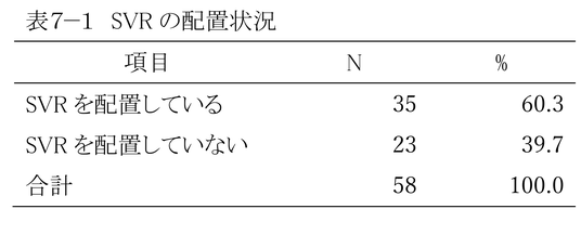 SVRの配置SVRの配置状況は、「配置している」が35件(60.3%)、「配置していない」が23件(39.7%)であった。SVRは約6割の自治体で配置されている一方、約4割では配置されておらず、配置状況にはばらつきがみられる。