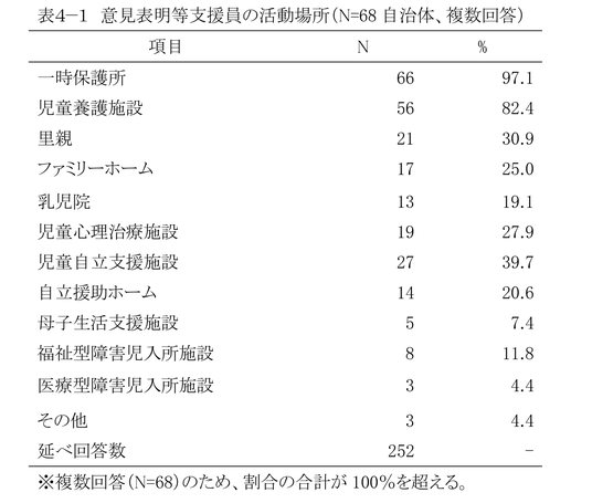 意見表明等支援員の活動場所意見表明等支援員の活動場所で最も多かったのは、一時保護所(66件、97.1%) であり、次いで、児童養護施設(56件、82.4%) が高い割合を占めた。