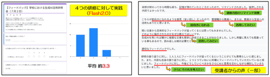 その上で、専門研修(教育 DX 担当専門研修)における試行導入、および受講者が記述した振り返りに対して生成AIがフィードバックを生成することの技術的・教育的な有効性の検証について、ご支援しました。