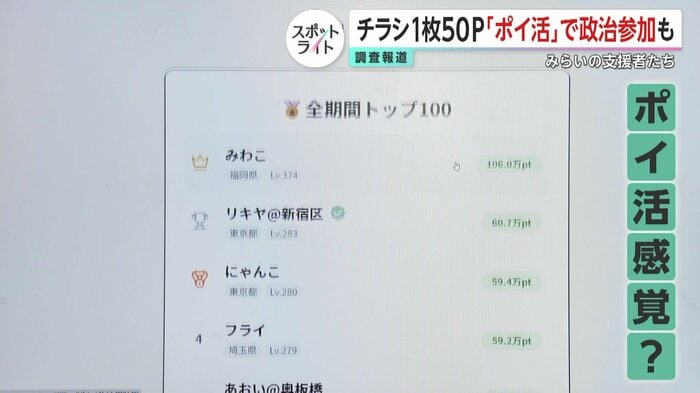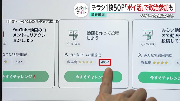 党のホームページを見てみると、1枚チラシを投函すると50ポイント、街頭演説を手伝うと400ポイント、動画制作をすると400ポイントと書いてある。