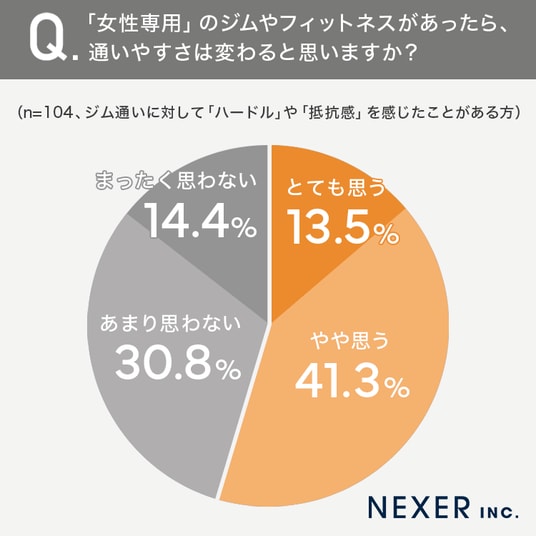 その結果「とても思う」が13.5%、「やや思う」が41.3%で、合わせて54.8%が女性専用であれば通いやすさが変わると回答しました。一方「あまり思わない」は30.8%、「まったく思わない」は14.4%でした。