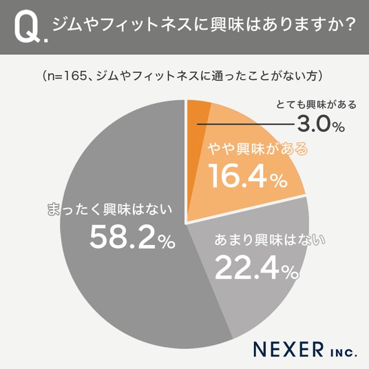 その結果「とても興味がある」が3.0%、「やや興味がある」が16.4%と、興味を持っている層は約2割にとどまりました。一方「あまり興味はない」が22.4%、「まったく興味はない」が58.2%で、合わせて約8割が現時点ではジム通いに消極的です。