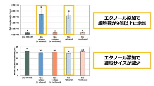 高濃度グルコースによる増殖低下の原因を調べるために、グルコース添加に加えて、エタノールまたはメタノールに溶解したビタミンE、エタノール、メタノールをそれぞれ培地に添加して培養を行いました。その結果、エタノールに溶解したビタミンEまたはエタノールを添加した際に、高濃度グルコースのみを添加した条件よりも細胞数が9倍以上増加しました(図2)。また、エタノールを添加した条件では、細胞の平均直径も減少し、紡錘形の細胞を示すようになりました(図2)。