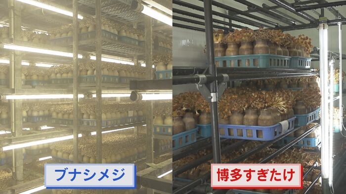 早速、キノコを栽培している場所に案内してもらうと、主力のブナシメジが所狭しと並んでいる。