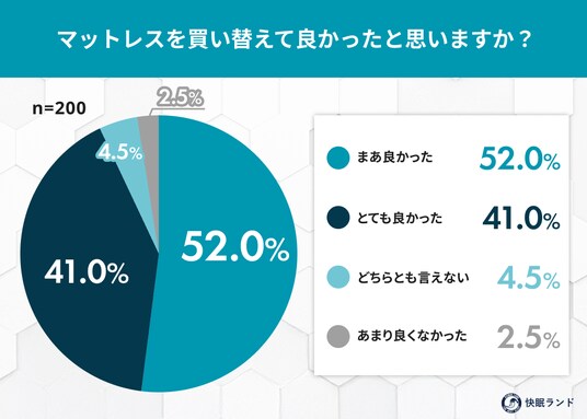 → 93%がマットレスの買い替えにポジティブな回答でした。 処分の苦労を乗り越えた先にある「睡眠の質の向上」が、生活全体の満足度を高めています。