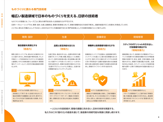 本レポートでは、製造業において当社がどのような役割を担っているかを役員インタビューとともに紹介。さらに「ものを開発・設計する人」「ものを生産する人」「生産設備を守る人」「現場を管理する人(常駐管理者)」の4つの視点から、現場で活躍するスタッフやそれを支えるワークライフ・サポーターのインタビューを通じて、リアルな現場の声をお届けします。また、各領域に対応するエンジニア研修センター、ものづくり技能センター、保全テクノセンターについて、就業前研修や専門研修などの研修カリキュラムをはじめ、当社独自の研修への取り組みを紹介しています。