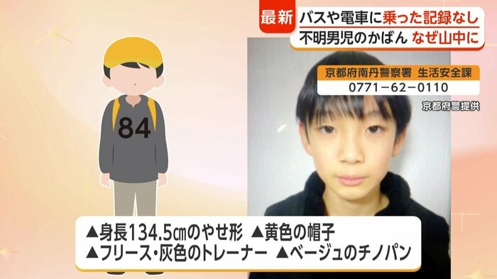 安達さんは身長134.5cmの痩せ形、黄色い帽子をかぶり、フリース・灰色のトレーナー、ベージュのチノパンをはいていたという。情報提供は南丹署生活安全課(0771-62-0110)まで。