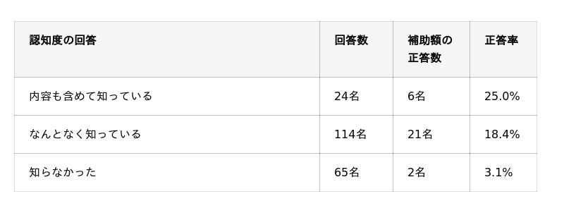 さらに注目すべきは、「内容も含めて知っている」と自己評価した人の正答率です。補助の内容まで把握していると答えた24名のうち、補助額を正しく選べたのは6名(25.0%)。「知っている」と答えた人ですら、4人に3人は補助額を正しく把握できていませんでした。