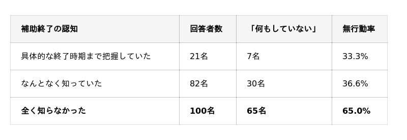 補助終了の認知度と対策行動の関係をさらに掘り下げると、補助終了を「全く知らなかった」100名のうち「何もしていない」が65名(65.0%)。一方、「なんとなく知っていた」人では36.6%、「具体的に知っていた」人では33.3%でした。