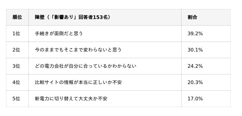 調査結果3.:電力会社の見直しを阻む最大の壁は「手続きが面倒」「どこが合うかわからない」。情報と心理の二重の障壁