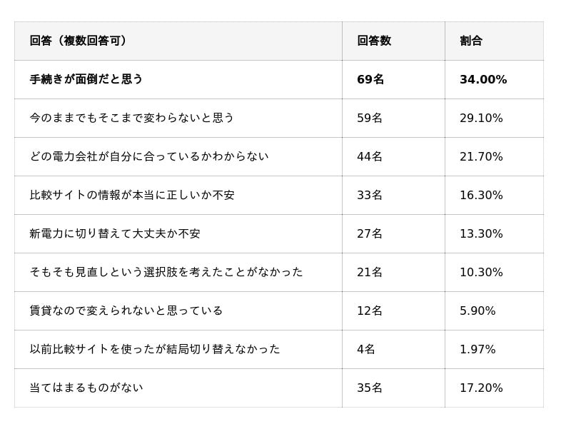 電力会社の見直しを阻む壁。「面倒」が34.0%で最多、「わからない」「不安」も上位に