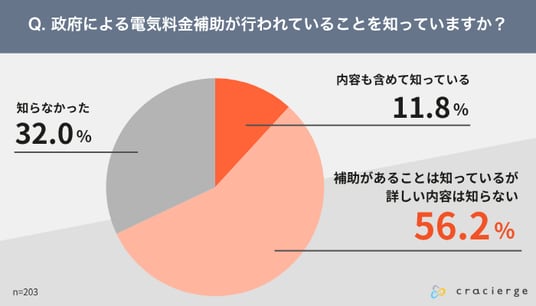 「政府による電気料金補助が行われていることを知っていますか?」という質問に対し、「補助があること自体は知っているが詳しい内容は知らない」が56.2%で最多。「知らなかった」も32.0%にのぼり、補助の内容まで把握していたのはわずか11.8%にとどまりました。