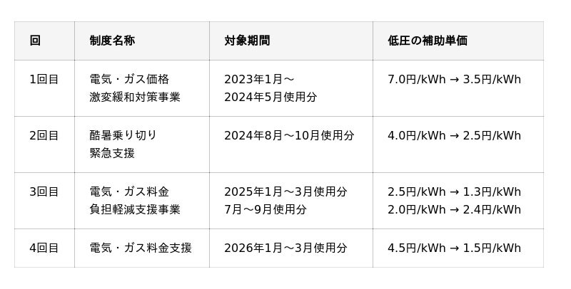 2022年のエネルギー価格高騰を受け、政府は2023年1月から電気・ガス料金の補助を開始しました。以降、名称や補助額を変えながら計4回にわたり断続的に実施されています。